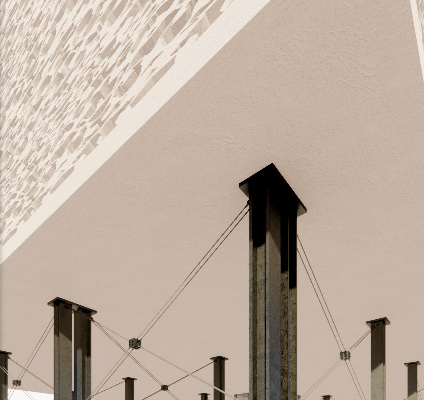 Exterior Concrete alongside Steel Stilts with Steel Cable Supporting Elements.