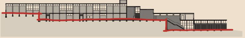 As a result, serviceability and utilitarianism took priority over embellishment and the school emanates the idea of equality using in-situ concrete. The cheaper choice to expose the concrete both on the exterior and interior, was in line with the Bauhaus ideology that materials should be used in their most honest, true form. This with laminated wooden doors and windows, gave the campus a uniform appearance. There was a conscious decision to go against the normal building conventions of the time, rejecting the idea of architecture communicating the status of a higher educational institute. With a reduced palette of materials and a renouncement of evoking pity nor flaunting wealth, the campus itself instead conveys the views behind the HfG teaching.