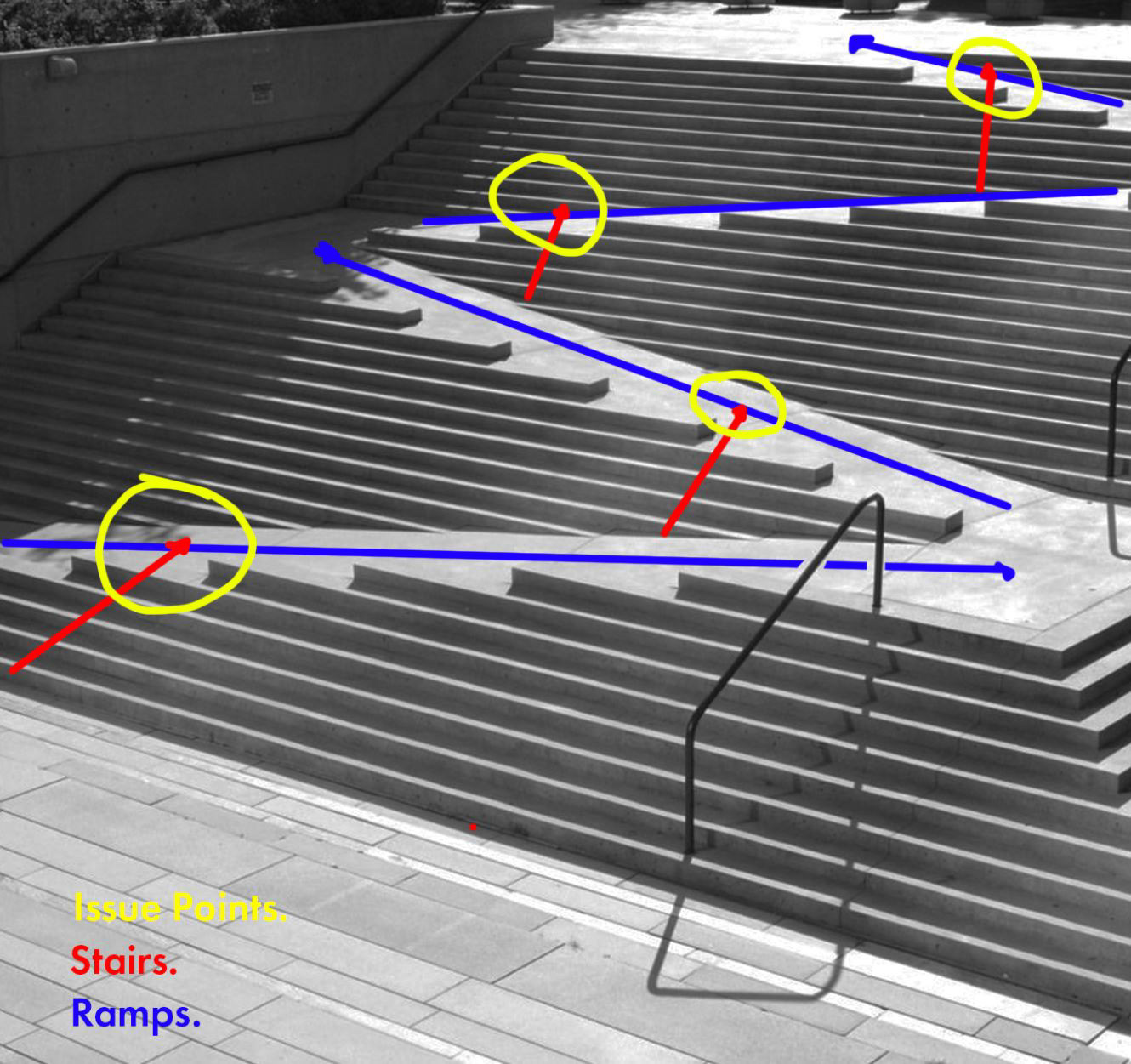 I have added railing such that no set of stairs is wider than 2m to meet the K regulations set out. I have also integrated seating into the areas closest to the ramp. These seats can be used as steps but also promote a sitting area to places which cross the ramp. This promotes a flow where people will mostly walk and cross the ramp at the larger flat parts. They also respond to the sun path.