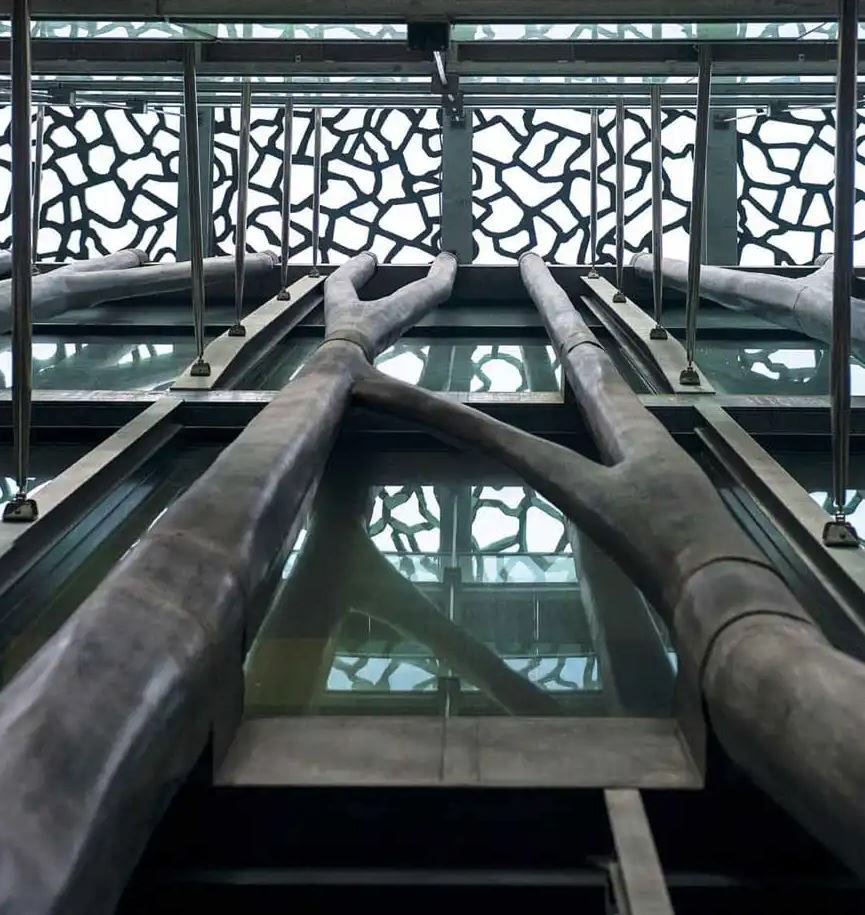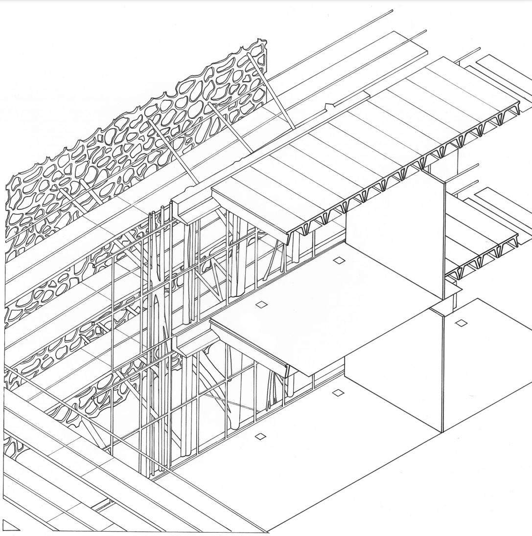 For the construction of the skin, the MUCEM Museum will be the main precedents. It uses filigreed concrete to create a rigid and light skin. It uses a high-performance concrete called Ductal. This is reinforced by organic or metallic fibres and is unique for its elimination of the inherent weaknesses associated concrete as a material used in construction. For example, the improved micro-structural properties of Ductal’s mineral matrix mean it is able to support flexural and tensile loads – even after cracking. It allows concrete to be far more ductile and resistant to corrosion, abrasion and impact. It is able to achieve lighter and larger dimensions of concrete than ever before.