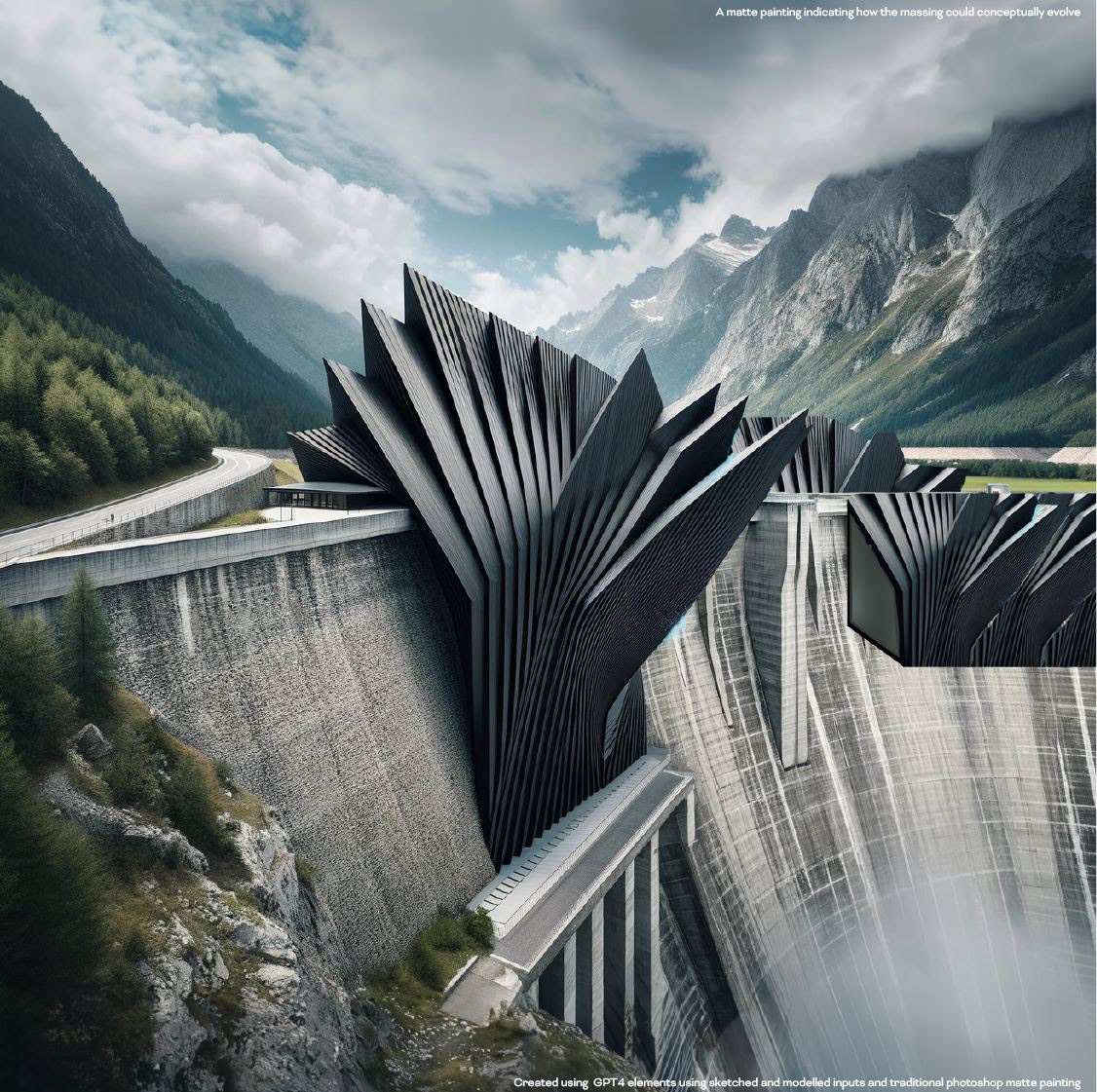I then used photoshop and previous ai outputs to create this matte painting of what my form could end up looking like once the massing is taken further.